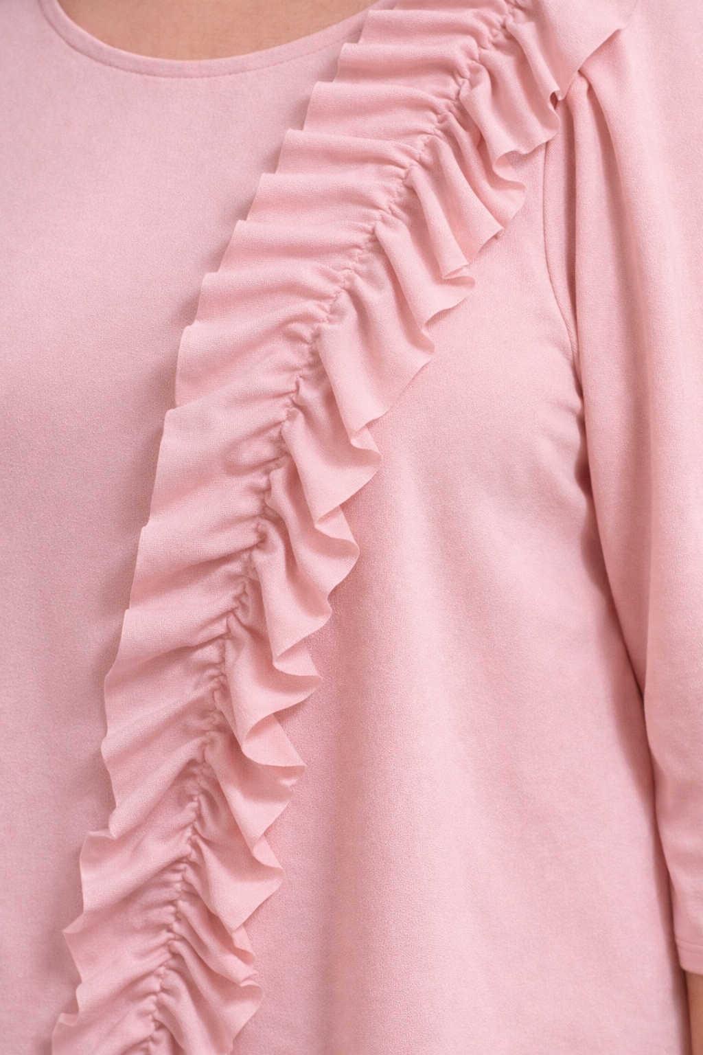 Vestido rosa elegante con diseño de volante diagonal que estiliza la silueta. Con manga 3/4 y corte cómodo, es perfecto para ocasiones especiales, eventos o para un look sofisticado en el día a día. Diseñado para ofrecer comodidad y estilo en tallas grandes.
