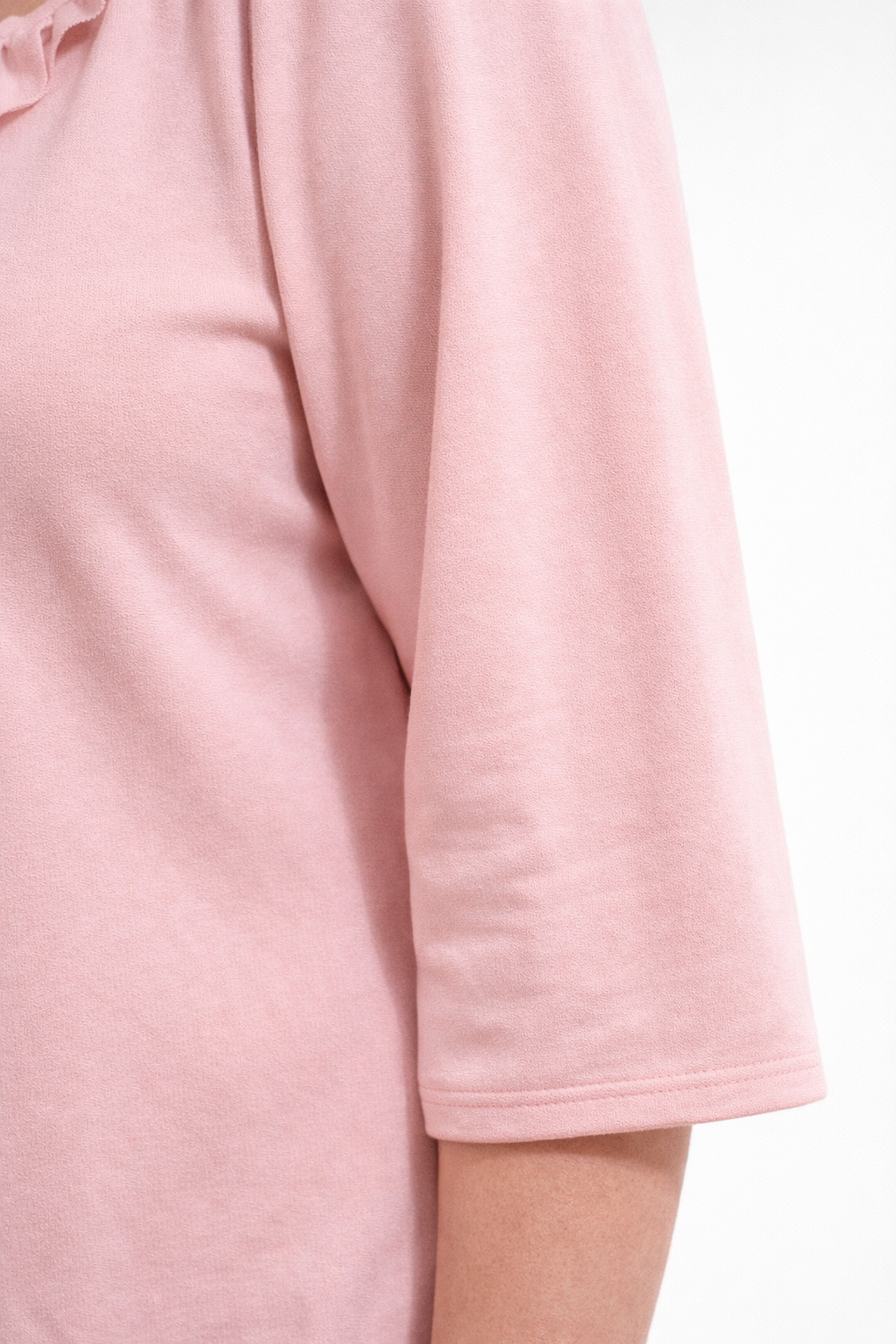 Este vestido rosa destaca por su detalle de volante diagonal, un diseño moderno y femenino que aporta movimiento y estilo al conjunto. Su corte amplio y cómodo lo convierte en una opción ideal para quienes buscan elegancia sin renunciar a la comodidad.